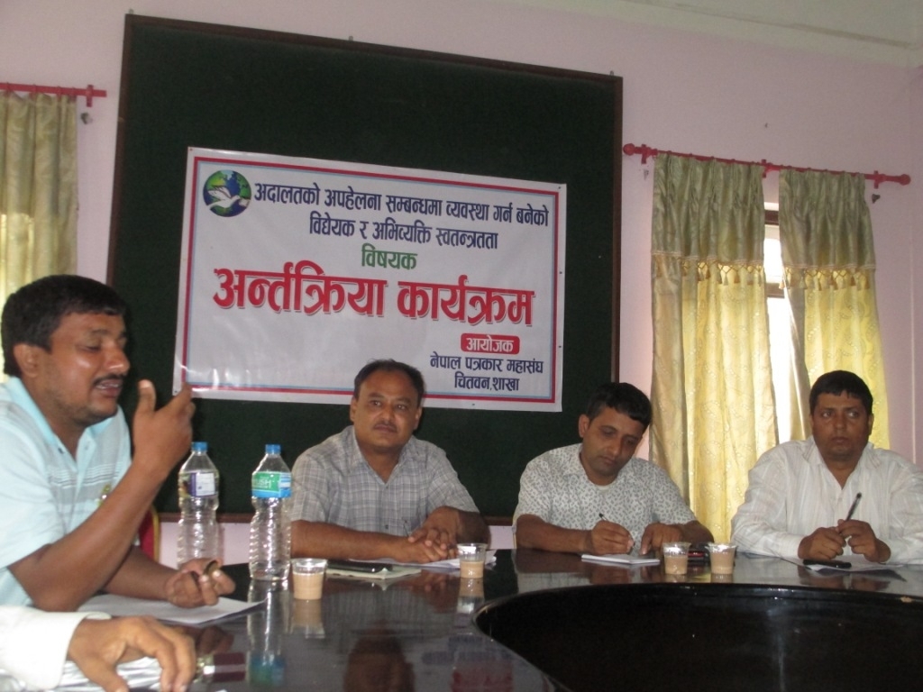 कार्यक्रममा नेपाल पत्रकार महासंघ चितवन शाखाका अध्यक्ष हरिप्रसाद पोखरेलले व्यवस्थापिका–संसद् सचिवालयमा दर्ता भएको ‘अदालतको अपहेलनाका सम्बन्धमा व्यवस्था गर्न बनेको विधेयक’ नागरिकको अभिव्यक्ति तथा प्रेस स्वतन्त्रतालाई अंकुश लगाउने उद्देश्यबाट आएको भन्दै आपत्ति प्रकट गरे । विधेयकमा उल्लेखित बुँदाले नागरिकको संविधानप्रदत्त अधिकार हनन गर्न खोजेको बताउँदै उनले विधेयक फिर्ता लिन सरकारलाई आग्रह गरे । अभिव्यक्ति स्वतन्त्रता विरोधि विधेयक पत्रकारहरुका लागि मान्य नहुने पनि उनको भनाई थियो ।