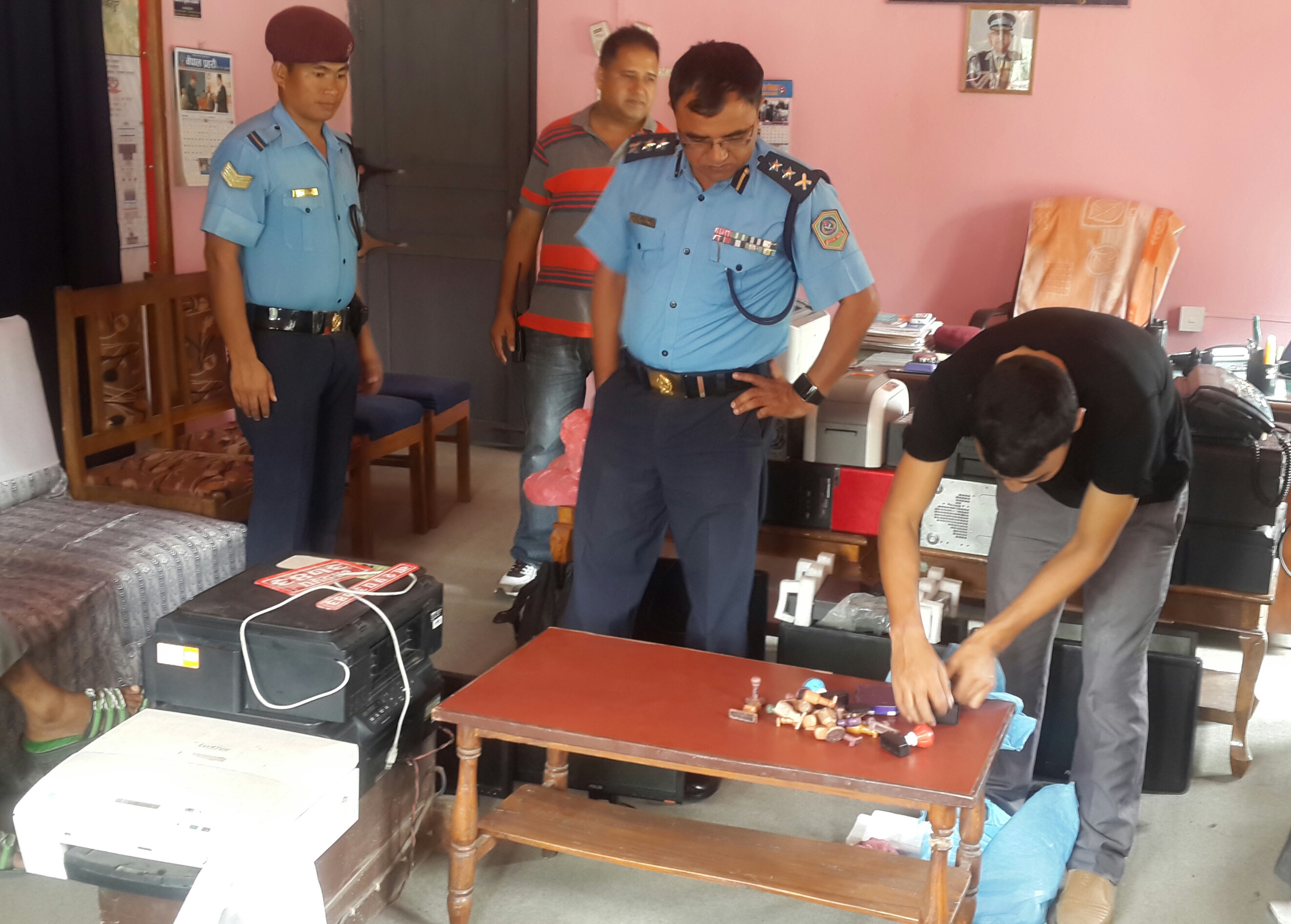 नमस्ते स्टेनसरीबाट नक्कली काम गर्न प्रयोग हुने कम्प्युटरको सीपीयु चार वटा, कम्प्युटरको मोनिटर पाँच वटा, रङ्गीन र सादा प्रिन्ट गर्ने प्रिन्टर छ वटा र एउटा ल्यापटप प्रहरीले बरामद गरेको प्रहरी उपरीक्षक थापाले जानकारी दिए ।